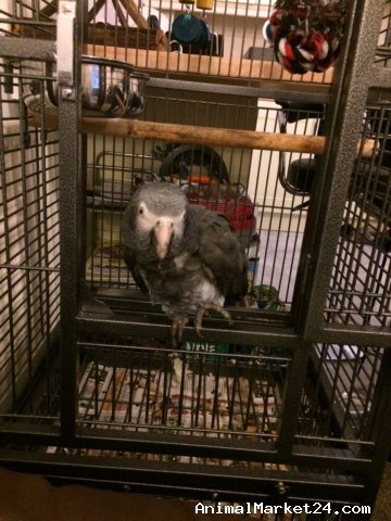 Hi adop my timneh african grey parrot, due to no fault of his own. Not had him long. Change of circumstances forces adop. Hes a very good talker once he gets used to you n his new surroundings. He prefers men more. Was told he is tame when i got him but i would say hes semi tame. Will take food from you. He loves grapes, apples, n monkey nuts. Comes with brand new cage. Food n toys.