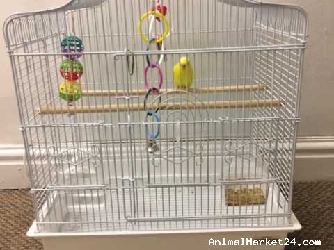 A Yellow Budgie. It is healthy and active and playful. It Includes New Cage with 2 Perches and 2 Feeders