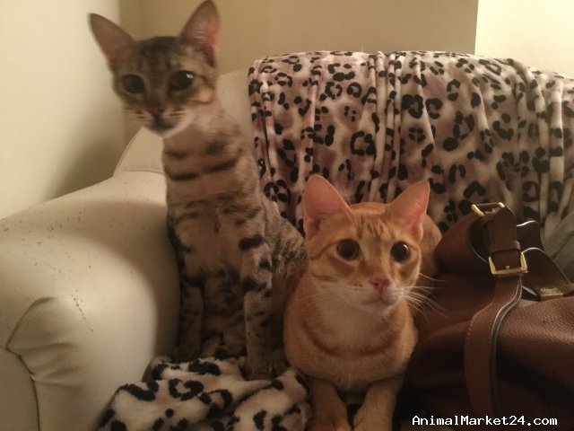 Two beautiful 7-month-old Arabian Mao kittens who need a loving home: a ginger boy ('Ginger') and a grey tabby girl ('Roo'). Rescued last October after mum had them in a cardboard box - both have been micro-chipped, had all injections and neutered/spayed. Would love to keep them but unfortunately can't house them where I'm living. Would be great to keep them together as they love each other very much and sleep together all the time. They have been indoor cats so far and could stay the same but equally I'm sure they'd adapt to adventures outside as long as they had a home to come back to. They are litter-box trained and love cuddles. If you are interested in giving them a loving home or have any questions please get in touch :-)