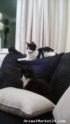 Not from same litter but they have been together since baby's so would like them to stay together. They are very loving. Boy is black with White nose and very fluffy. Girl is black and white short haired.