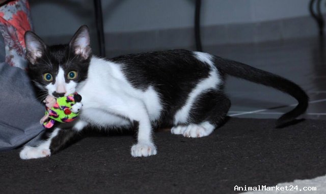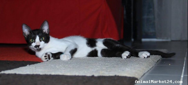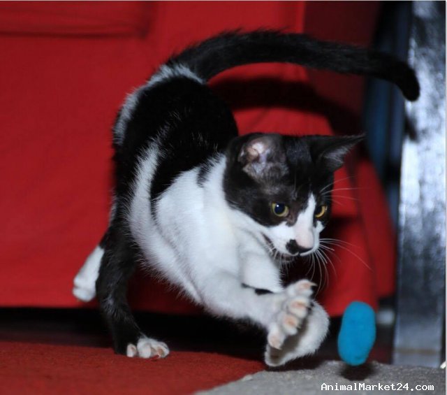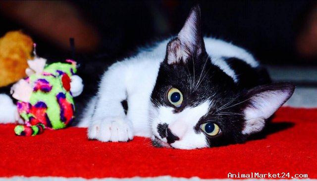 Billy is three months old and the cutest little chap with half a mustache and a goatee beard! He has the ability to make you laugh and forget your troubles! Very affectionate and good with kids, dogs and other cats. Fully vaccinated and microchipped!