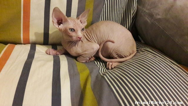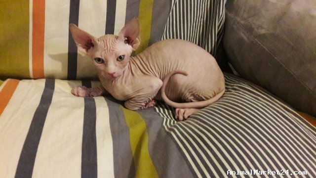 Sphynx cat for adoption, Dam is a elegant cream tabby and sire is a muscular blue/black with piercing blue eyes.