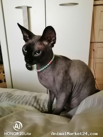 Beautiful Seal Point Bambino (long legs) Sphynx female . She has her 2 vaccinations,microchip and is Vet checked twice. is wormed regularly.So everything is for a year. We adoption her as a pet without registration but she can be registered with Tica Active. She can leave us after second vaccination . Any questions,please email me.