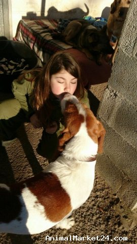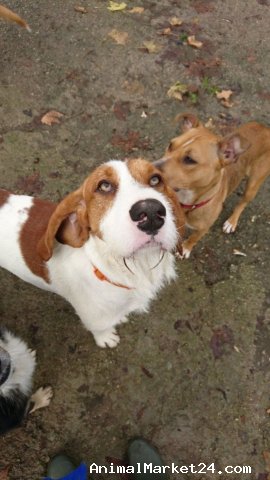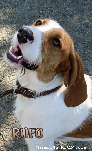 He's a 3 year old Griffon Sabueso cross. They are active, often with pretty challenging recall and very loyal and loving and good-natured. He was kept in bad conditions and was never wanted.