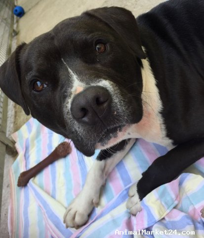 Enzo is a stunning black and white 16 month old Staffy cross boy (possibly with Spaniel as he has floppy ears!). He is medium sized, and a strong chunky young man. Enzo is really friendly, and is good with children. He is also good with other dogs, but very playful so may be too much for some dogs! He has had some good basic training, and is a clever boy who picks things up well. Enzo isn’t used to being left alone, and does get upset when he’s left at the moment, so he needs a home where he won’t be left alone for long. He’s an active boy who needs plenty of exercise and would love an outdoorsy home where he can get out and about walking. He is a fab young boy and will be the most loyal companion for his new family.