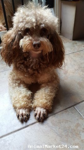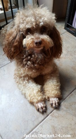 Isaac is a TINY PROVEN chocolate and cream phantom toy poodle for adoption only .