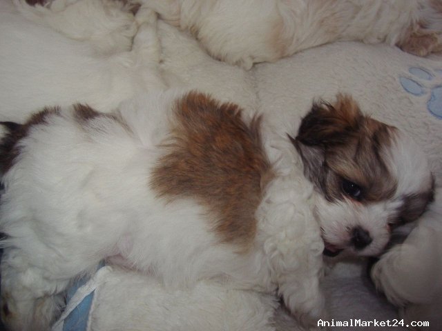 shih tzu x maltese beautiful little pups, we have 1 male and 1 female left out of a litter of 5. pups are brown / dark brown in colour with bits of white under there chin, these pups will be wormed, fled, first needles, vet checked before they go, can be seen with mum, will be handled daily as brought up in a family home with young children and other pets.