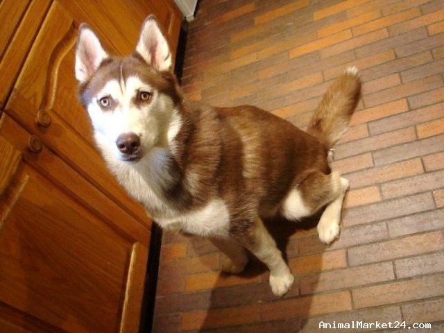 Here we have my huskey male he's registered he's fox red over white he's a lovely dog for more info please call