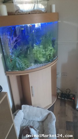 My stunning fish tank is only for adoption due to the fact of me no longer being well enough to keep up looking after it this bow front corner tank is beautiful in any room it has an external filter new tetra air pump and led ligts a volcano air blow that changes colours and lots of plants ornaments and some fish pair of dwarfs gourami guppys ballon mollys corys and an angel fish everything including treatments will go all together sorry wont sperate and pleaseno hagglers or picture collectors im just not got the time do deal with ppl like that sorry beautiful bargin tank will miss it once gone tbh any more info please message me thank you