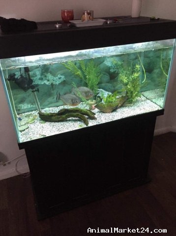 Hi, my 250litre fish tank with two large red bellied piranhas, tank comes with everything youll need. Heater, gravel, air pump,plants etc. Filter and lights are built in know cracks or anything tank is water tight im still using my set up now . Feel free to Email me for more pictures and info,