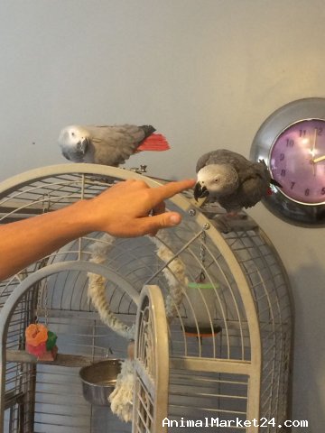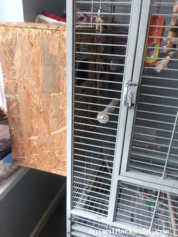 . Female and male female is very tame to men and my children male is not hand tamed he prefers women and loves a stroke been together all their life female has started laying eggs this year infertile don't think male is mature enough yet so could be a good breeding pair in future or great pets . Cages are put together at the moment so they can both go in each other's and a large nesting box is attached to the side now . Very talkative both of them will be a sad adoption but have no choice would like them to go to experienced person please I will not separate them your welcome to view them
