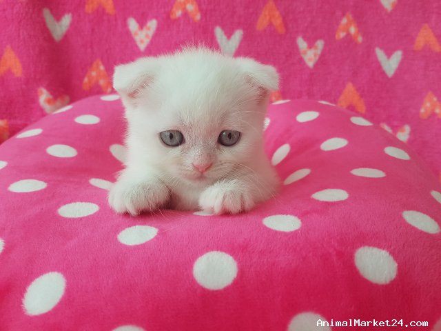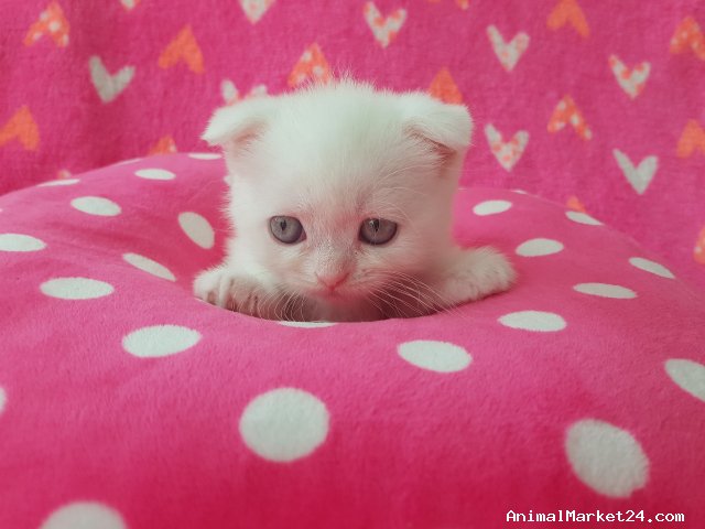 Availible for sale pure white scottish fold frmale kitten, from father with pedigree. for 3500dhs.