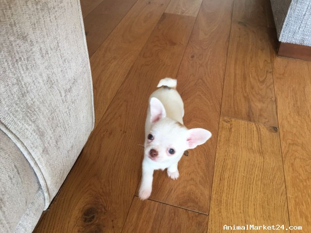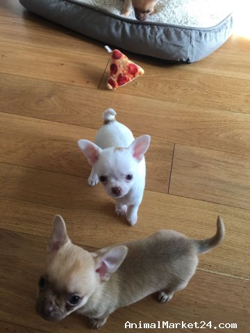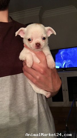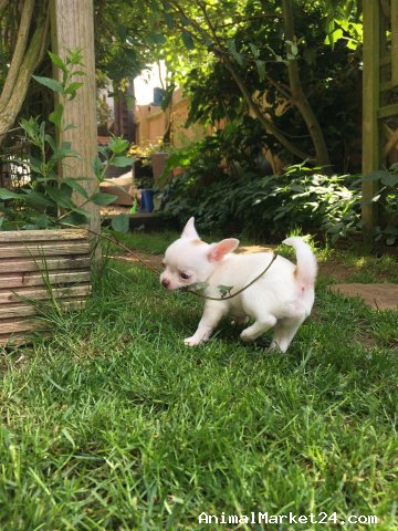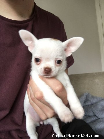 We have two gorgeous pure bred pedigree miniature chihuahua puppies for sale. One pure white baby boy and one light sable baby boy. They are of premium quality, very compact and just perfect! These very precious boys are the small type which are often described as teacup size. They will only grow to be around 2kg!