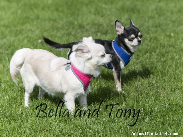 Mum, is a Long haired White Chihuahua, pedigree registered (you’ll get a copy of her 5 Generation Pedigree papers). Father is a short haired, Apple Dome head and short nose, Black, white and fawn Tri. (His parents are pedigree, ) Both can be seen as they are our family pets.