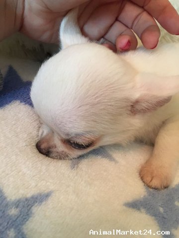 absolutely huge Apple domed head with a virtually non-existent button nose he has correct shape to his body so he is going to be short and cobby like a good chihuahua should be and not long and thin with long legs ! Like most that you see advertised on here !