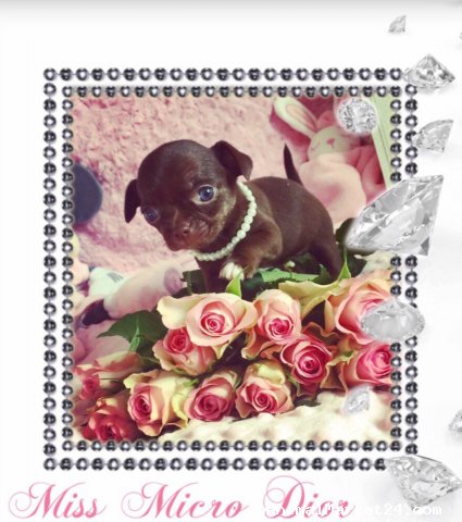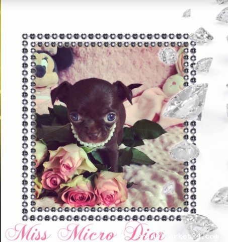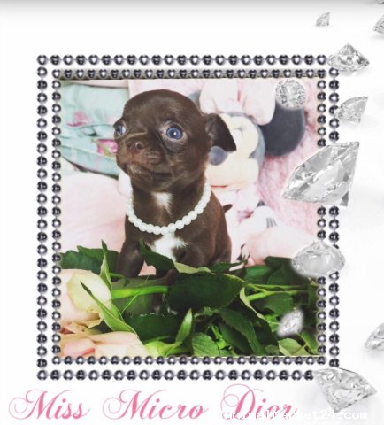 Cherished Chihuahuas presents.. An ESQUISITE, KC REGISTERED, BLUE EYED, BITTER CHOCOLATE, SUPER FINE SMOOTH COAT, MICRO TINY GIRL !! Miss Micro Dior .... Is available and will be ready to come home with you at 8 weeks of age . I will not let this absolutely precious darling go until that age, until she is fully weaned, completed her full vacinations, worming/fleaing prevention programme and been microchipped. This VIP quality pup possesses the most brightest blue eyes ! She is bitter chocolate in colour, with 4 symetrical white socks and a white chest. Such a boutique teacup baby ! Her rare size and colour makes her one of a kind in the uae ! there is nothing else like her available, just so perfect ! This super sassy pup is so out going, and will courageously take on my 4ft standard Poodle for a play fight ! But at the same time will blissfully snuggle on your lap and is full of kisses ! Mum and Dad were exclusively bred to produce the utmost textbook teacup Chihuaha puppies. Mum is a Micro total lap of love, and weighs just 2.9 lbs and stands just 5.5 inchs tall. She is my beloved pet and lives here at home with her litter. Dad is just heaven, he is a Champion in Show USA import. He weighs just 3.4 lbs and stands just 6 inches tall. My friend owns this tiny chap and have plenty of photographs of him. This dream puppy possesses - • The perfect expression. • Super short muzzle. • Huge expressive eyes. • A superb apple domed head • Remarkable compact body. • Sweet and confident disposition. This extreme baby face is estimated on the growth chart to be just two and a half pounds fully grown !! Our pups come to you - • Fully weaned onto Kennel Club recomended Eukanuba Small Bite puppy food. • With full vacinations so your baby is ready to head out and meet the world. • Having completed a full worming / flea prevention programme. • Microchipped. • With Kennel Club papers and 5 Generation Pedigree Certificate. • 5 Weeks Kennel Club . • All you need puppy pack, ready to b