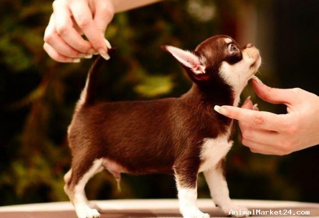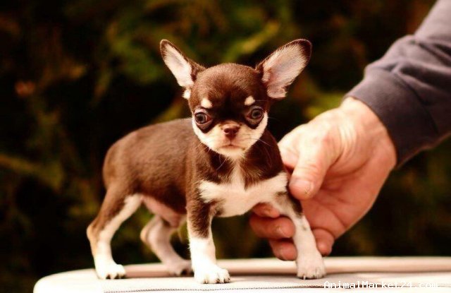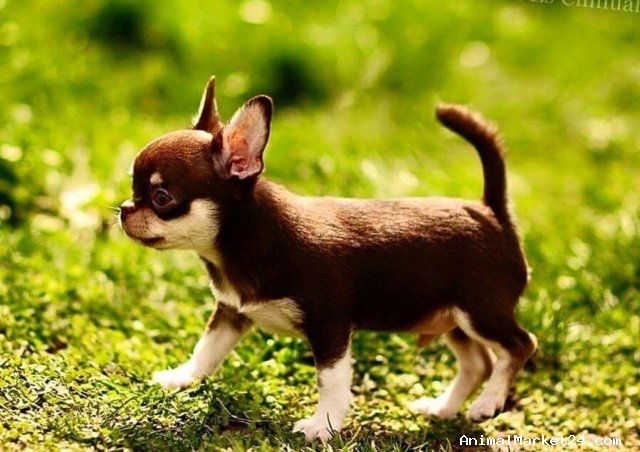 This is rocco. He is 12weeks old . Rocco Is a sweet natured boy with everything going for him. He has the correct 6x6 scissor bite, short deep muzzle, level topline, correct ear set, apple domb head and big eyes. Rocco is chocolate and cream with many chocolate family members in his pedigree. Please call if you have any more questions.