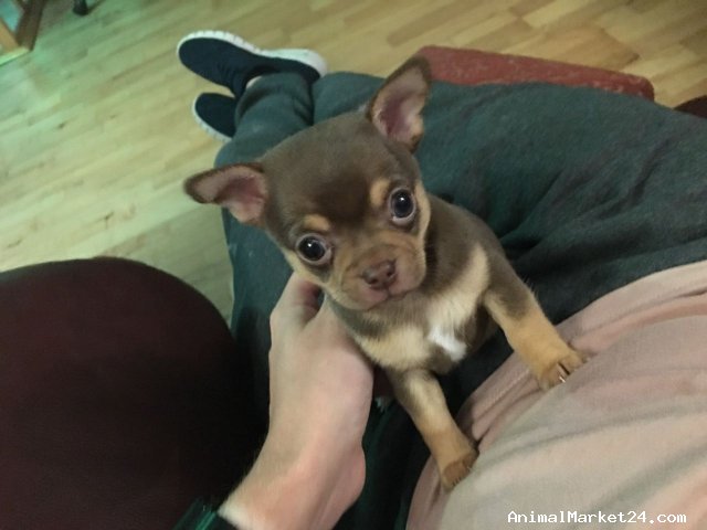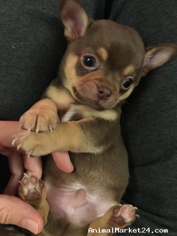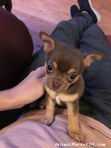 Our beautiful Chocolate tri Chihuahua bitch Biscuit has had a litter of 3 lovely puppies (her crumbs), who already have marvellous temperaments and perfect apple-dome heads, who are seeking loving forever homes.