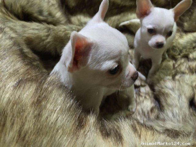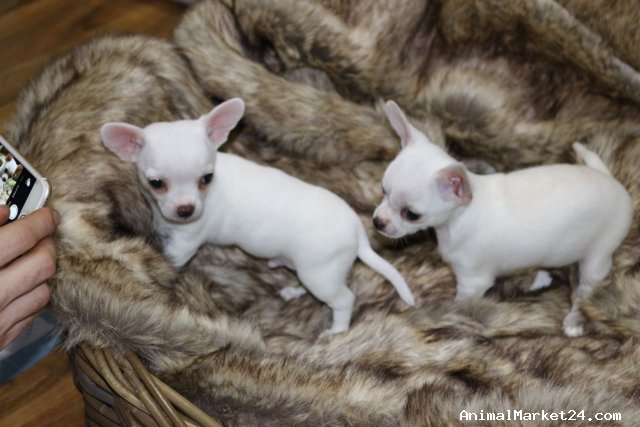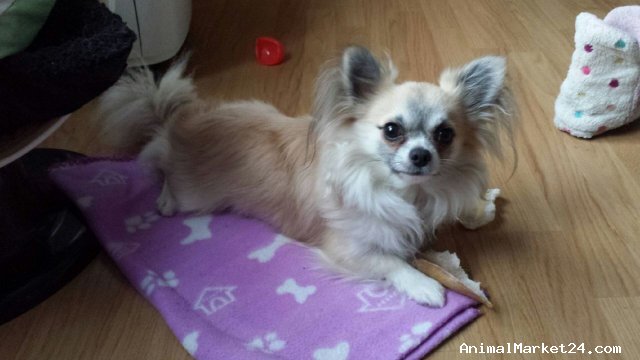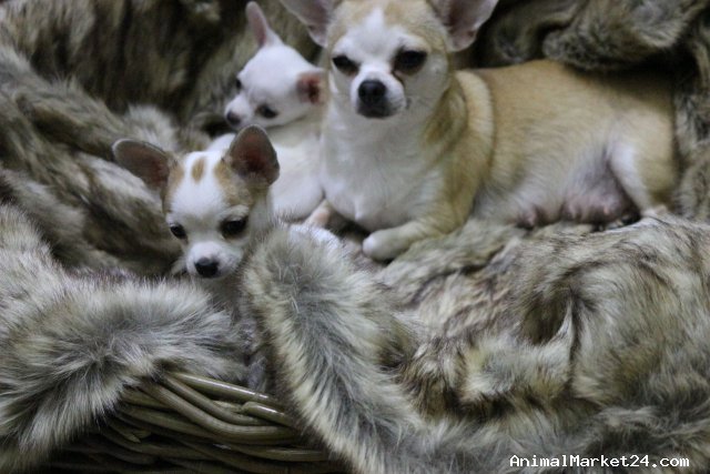 Daddy is the smalest chihuahua boy that i seen,him is light fawn with white and bluish ears,him don`t have a KC as the previus owners ask a masive extra for the papers and we didant get them,so the puppys will be sold as pets for home only.