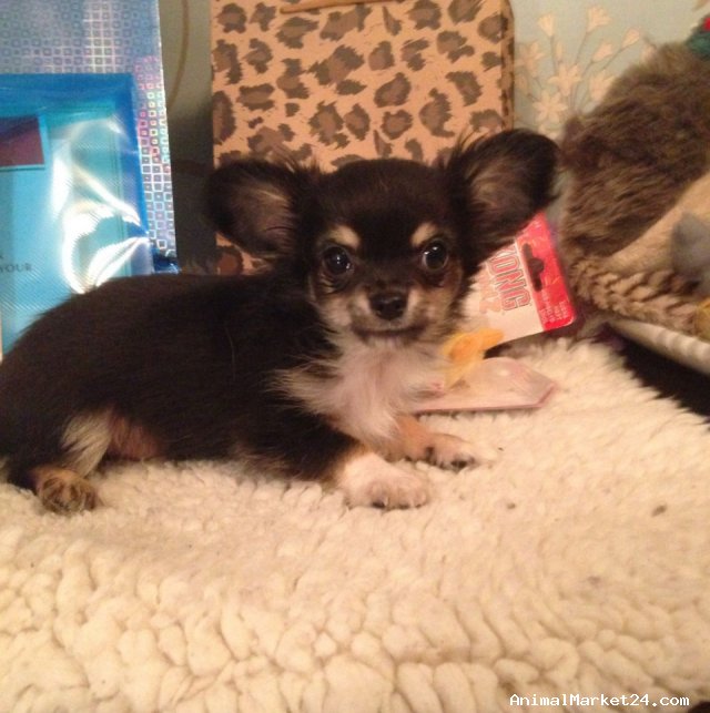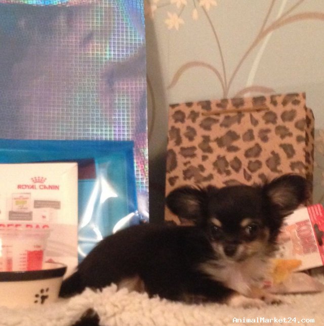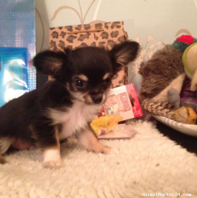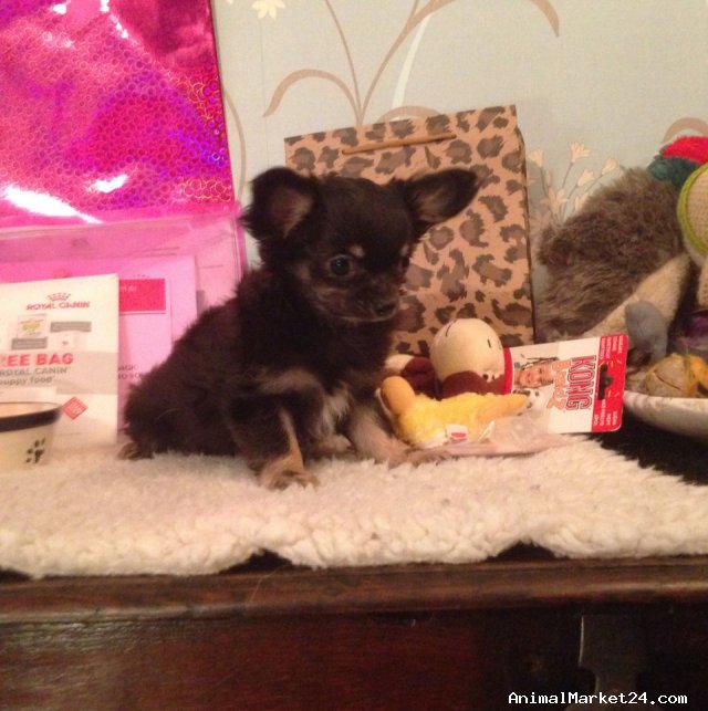 Here at Lisachi Chihuahua's we have a carefully planned litter of 3 adorable quality longcoat Chihuahua's 2 available both stunning, and true to type. ready Now. Puppies are lavishly reared in a busy household with other animals and children. Mum is our gorgeous Diana, she's a tri colour and Dad is my beautiful Teddy he's gold. Puppies have an excellent pedigree, good lines with champions and international champion included. 1 Black and Tan bitch very outgoing and very playful, lovely long coat, would make a good breeding bitch and a tri dog (boy) playful and nicely marked, weighs a tiny 1kg Puppies are K.C registered and fully vaccinated, vet checked, insured, wormed, microchipped and come with K.C papers, an official KC five generation pedigree, Royal canin puppy pack, Royal canin food, blanket, bowl and toys. Only available to the very best homes.