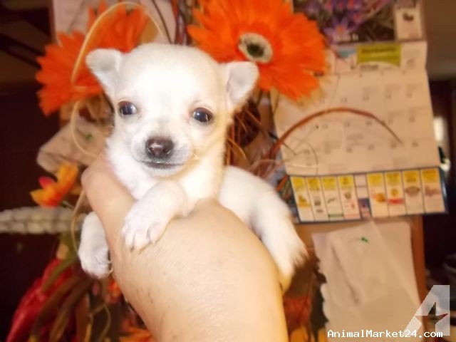 This is the smallest pup i have ever seen she is like suite little the mouse,she is pure white smooth coat ,will be tiny so will need special care as she is very fragile , so must go to special home please. Parents kc but pup will be pet only will come with food toys blanket .