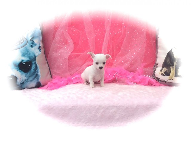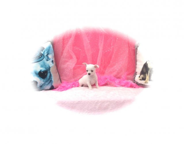 Two very beautiful pure white boy,girl. Mum is a pure white chihuahua with the beautiful short nose and big beautiful brown eyes 4lbs. Dad is chocolate and tan. He also has the very desirable apple dome head and short nose 3.5lbs. Both parents are available to see with the puppies. Genuine Micro boy is charting 2lbs-2.5lbs full grown. He has an apple dome head and he is very beautiful! . Genuine Teacup boy,girl are charting 4lbs they are also very beautiful!