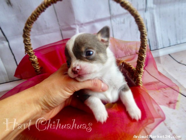 We have 5 beautiful pups with apple domed heads and short muzzles. They have champion dogs in their pedigree. There are 4 girls (lilac, blue and two tri-colour chocolate and tan) and 1 black boy. They will be ready to go to their new homes . Both chocolate and tan, the blue and the lilac girls.