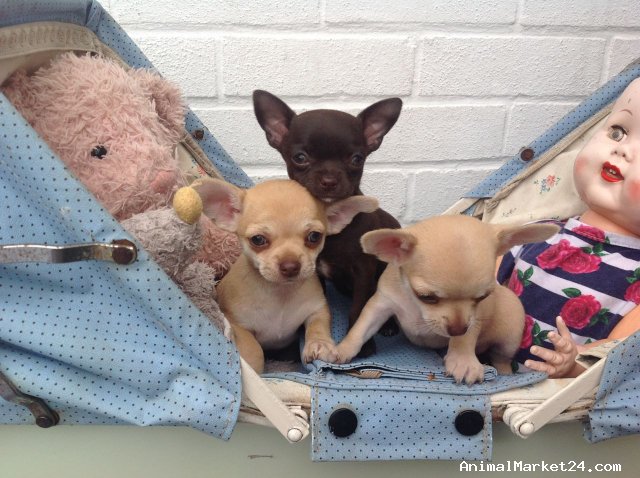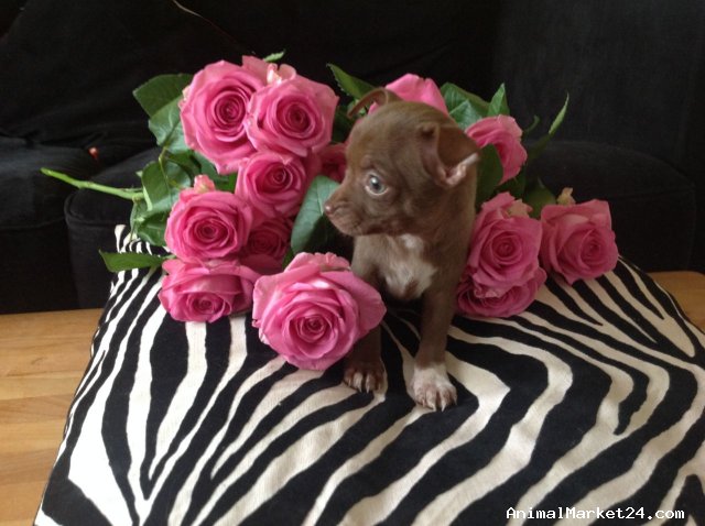 I'm delighted to announce a much anticipated litter from My stunning very rare solid chocolate girl, I have 3 Georgous Very Tiny pups, 2 solid dark chocolate and 1 dark choc champagne tri. Mummy comes from a long line of chocolate and lilac, with many champions in her bloodline, Sired by my famous stud Elvis who also has champions in his bloodline, both are Very tiny and are exceptional examples of this amazing breed, very true to type, Lovely Apple heads ,short stop , and both incredibly tiny. Elvis is quite possibly one of the smallest chihuahua's you are likely to see, seeing is believing ! weighting in at 1.8 kilos, He always produces incredibly tiny outstanding quality very true to type pups. And he is here for you to meet .Both parents are our much loved family pets and have amazing temperament's .