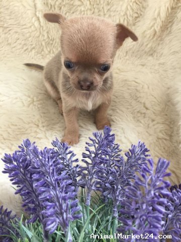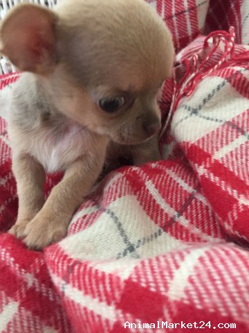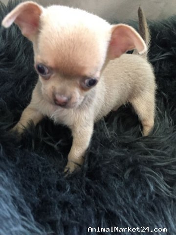 We have an absolutely gorgeous TINY TINY Chihuahua boy available . He is absolutely gorgeous, has a short nose and is going to be smooth coated. He is coloured like liquid gold.......... a really UNIQUE colour!