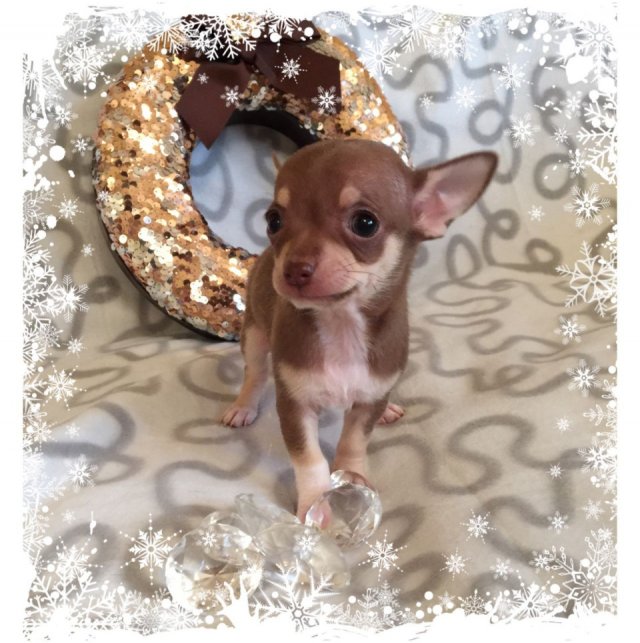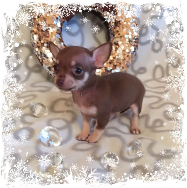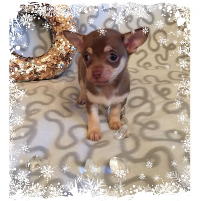 I have a five very special little puppies, 1 boy and 1 girl looking for a first class home Their mum is a gorgeous chocolate and dad is lilac & tan. Not only are my chihuahua's pedigree registered with many champions in their line, including Delta Force, Dachida's and Bermac to name a few. They have also stared in campaigns for Closer magazine. I take great care I want my puppies to go to only the very best homes. They have been lovingly cared for in my home and are used to a busy household with children a bigger dog and lots of fun & laughter, they are very well socialised and have already started to developed lovely little personalities. They will be paper trained. You have to see these gorgeous puppies to appreciate how truly stunning and small they are. They will be ready to leave for their new home on or after the 6th January. They will leave with a large puppy packs including food, toys, blanket etc as well as their Registration Papers, 5 Generation Certificate . The boys are with paperwork and the girls with paperwork. Please be aware that a puppy is for life and they need a lot of love and care so please no time wasters!! Thank you.
