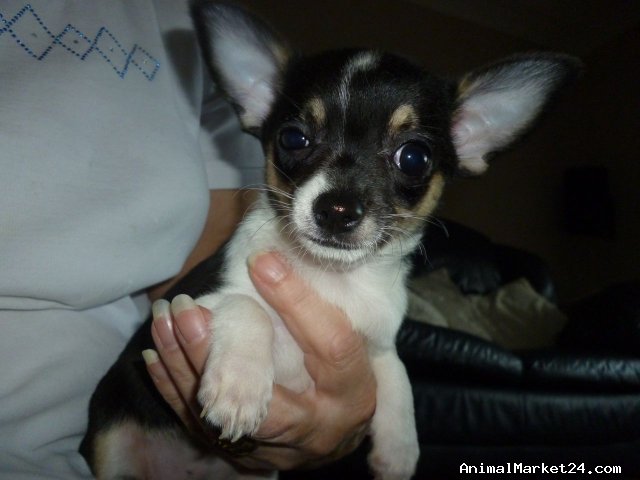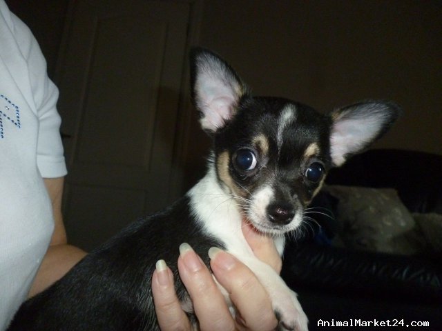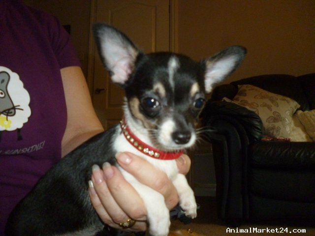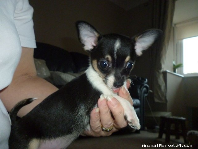 This is the only tri colour in the litter of 3. She is mainly Black with brown "trim" and white accents, and she is little!