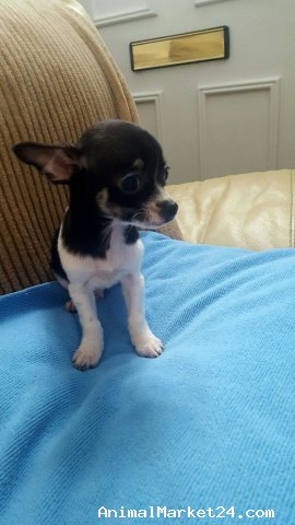 Beautiful tiny Chihuahua puppy ready to go now. Both parents can be seen. He comes with his 5 generation pedigree papers and a veterinary health certificate. He is microchipped and wormed to date. The puppy is black and white. Feel free to ask any questions. the puppy is small and will make a small adult dog. the puppy is well socialised and looking for a loving home. Viewing advised to see how small and beautiful He is. Both parents are kc although Dennis won't be. Dennis is a smooth coat.. .