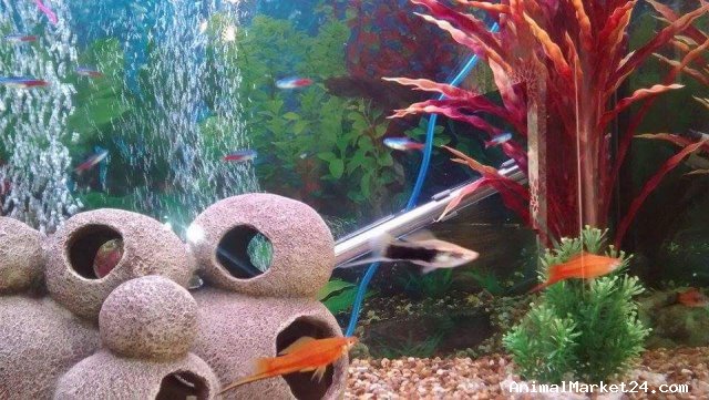 Includes fluval U4 filter, fluval heater, twin t8 lights, air pump, air stone, deco, background, net, water conditioners and test kit. Everything you see is 3 weeks old from new and is in immaculate condition.