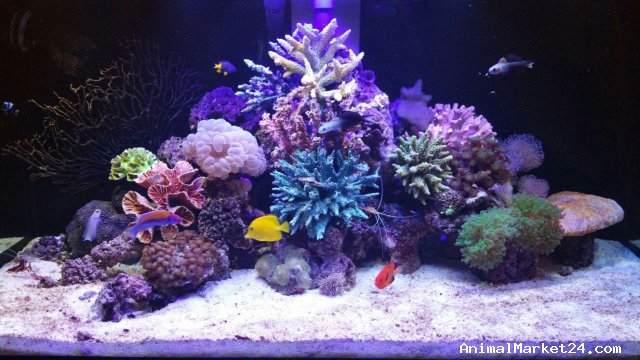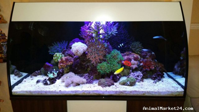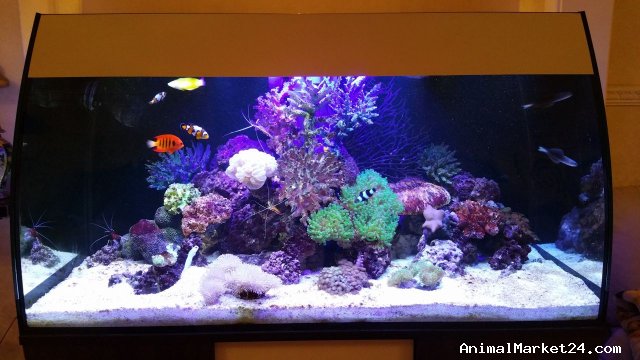 This tank is a beautiful piece of art. Very rare as a marine set up - looks like a contemporary piece of furniture and sits beautifully in most homes, unlike a lot of other large tanks which can be quite imposing. It measures roughly 3.5 feet across, 4.5 feet tall and 51 cm deep. The set up is complete with heater, TMC 450 protein skimmer, aquaray LED blue and white lights (2 bars), large powerhead, drilled with basic sump in the cabinet and return pump plumbed through back in to the tank to create plenty of flow. It will also come with a hydrometer, test kits and fish, corals, live rock, clean up crew, food etc as well as a remote control for all functions. Fish included are a regal tang, 1 black/white and 1 snowflake clown. Corals - hammerhead, bubble, leather and polyps as well as some artificial corals. Please contact for further details - set up is about 4 years old but in very good condition - looks new and will be sold as it is, with everything, so there will be no need to buy anything extra afterwards.
