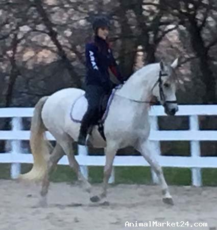 PRICE REDUCED FOR QUICK SALE! ACCEPTING OFFERS! DaVita is a breathtaking Andalusian/Arab Grey Mare with professional dressage and some hunter training. She is great fun to ride in a variety of disciplines and an elegant mover. Her walk is relaxed with a good swing and overstep. Her trot is active, balanced and easy to sit. Her canter has scope and freedom. Easy to handle and a loving personality – she loves to hang out with her humans and have a spa day! Her white coat is very easy to keep clean, most dirt will just brush right out! Really! She is a confident mare and knows she is gorgeous! She is a horse who knows how to impress, with good enough gaits to win at the dressage shows. She is the perfect horse for a family with both hunter and dressage riders– she has done a little bit of everything: from trail rides to dressage, plus a bit of cross country and a few horse shows. DaVita even spent a couple months in Wellington, FL learning her jumping basics. Currently in training in dubai.PRICE REDUCED FOR QUICK SALE! ACCEPTING OFFERS! DaVita is a breathtaking Andalusian/Arab Grey Mare with professional dressage and some hunter training. She is great fun to ride in a variety of disciplines and an elegant mover. Her walk is relaxed with a good swing and overstep. Her trot is active, balanced and easy to sit. Her canter has scope and freedom. Easy to handle and a loving personality – she loves to hang out with her humans and have a spa day! Her white coat is very easy to keep clean, most dirt will just brush right out! Really! She is a confident mare and knows she is gorgeous! She is a horse who knows how to impress, with good enough gaits to win at the dressage shows. She is the perfect horse for a family with both hunter and dressage riders– she has done a little bit of everything: from trail rides to dressage, plus a bit of cross country and a few horse shows. DaVita even spent a couple months in Wellington, FL learning her jumping basics. Currently in training in du