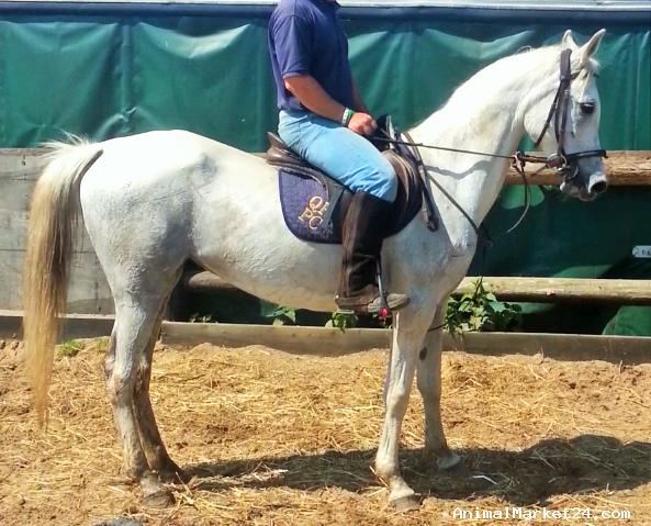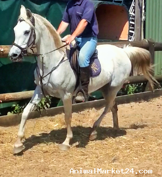 Lia is a 15.1hh grey 7 year old registered Arab mare . Lia is a lovely mare to have around easy to handle lives out in a mixed herd , mounts from the block and will walk , trot , canter in the school but not well schooled , hacks alone or in company never strong or fizzy hacks on a loose rein even on grass and in open spaces will also follow along nicely behind without getting fizzy , passes any traffic with no bother , can pull a moody face when girthing up but good to load , travel , catch , traffic etc... looking for a loving home , registered and passported Arab Horse Society , tack and delivery available